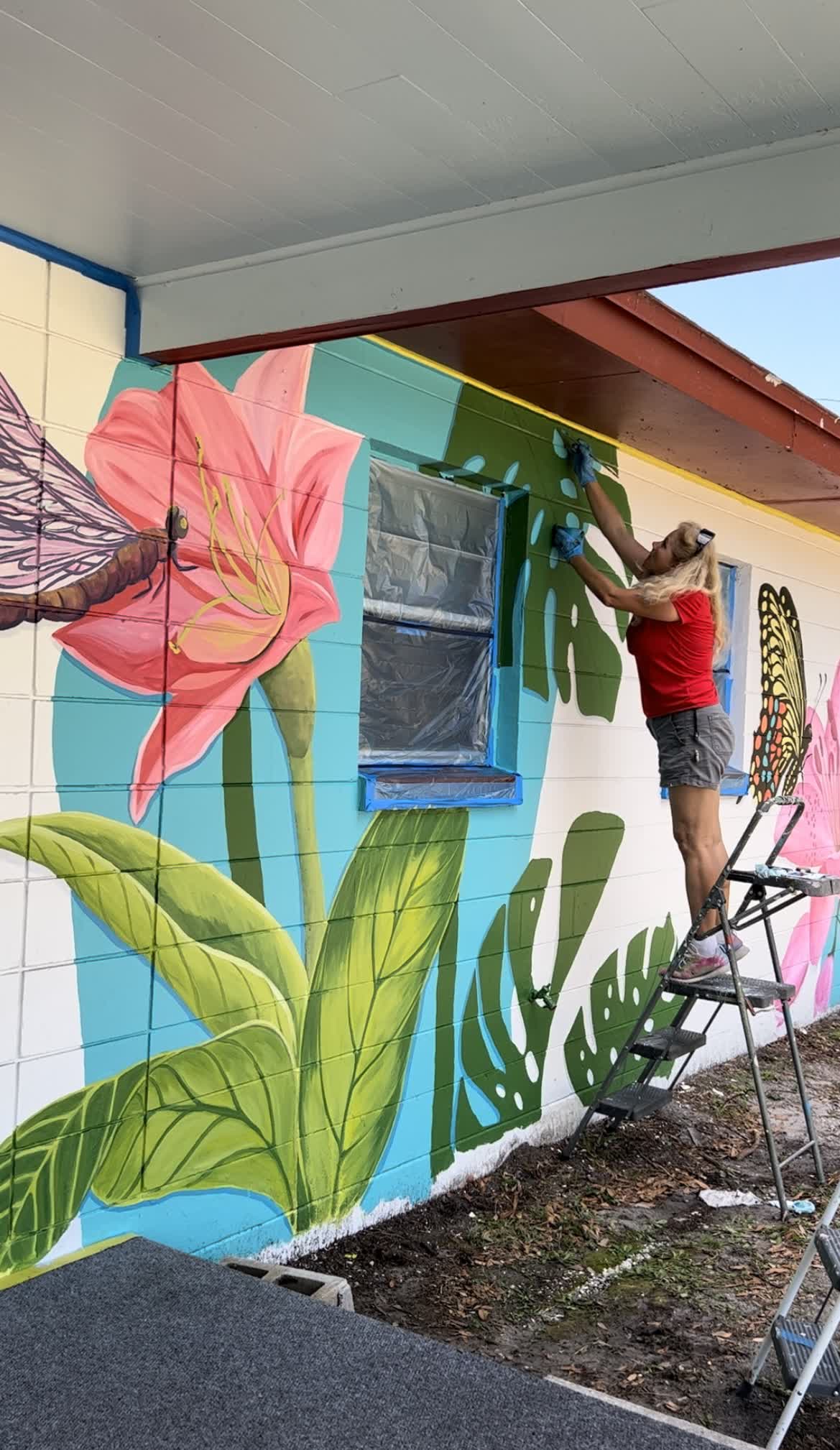 Materials: Professional exterior mural paints, UV-resistant finishes